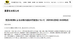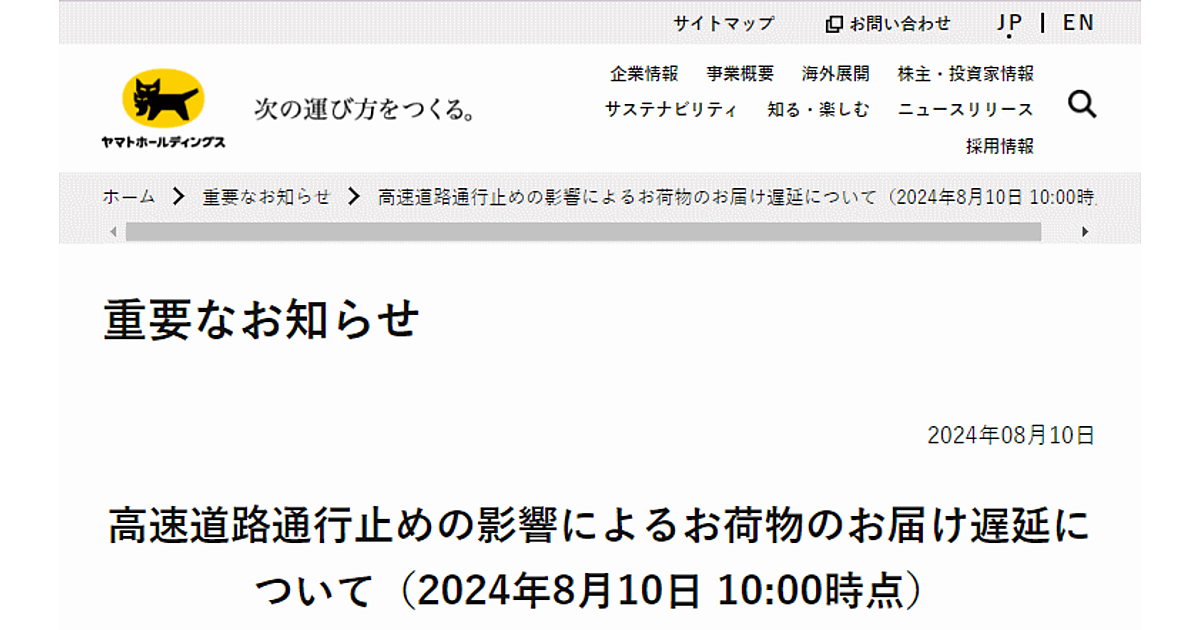 ヤマト運輸は次の発着荷物について、配送に遅れが予想されるとしている。