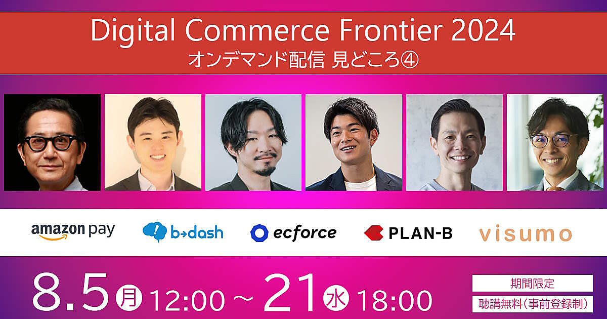 楽天グループ、ミレー・ジャパン、Amazon、プラス、コクヨ、TENTIAL、ルームクリップ、柳田織物などが登壇した「Digital Commerce Frontier 2024(DCF)」(7月24+25日に開催)。「もう一度見たい」「オンライン配信でじっくり見たい」といった要望を受け、オンデマンド配信を実施しています!