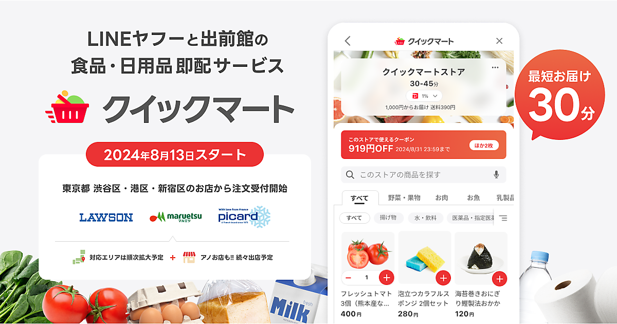 LINEヤフーと出前館は8月13日から、生鮮食品や日用品などを最短30分で届けるクイックコマースサービス「Yahoo!クイックマート」を開始した。同日から都内港区・渋谷区・新宿区でサービス先行開始とした。今後は医薬品など取扱商材の拡充や、2024年中には全国の出前館の配達エリアに拡大する予定としている。