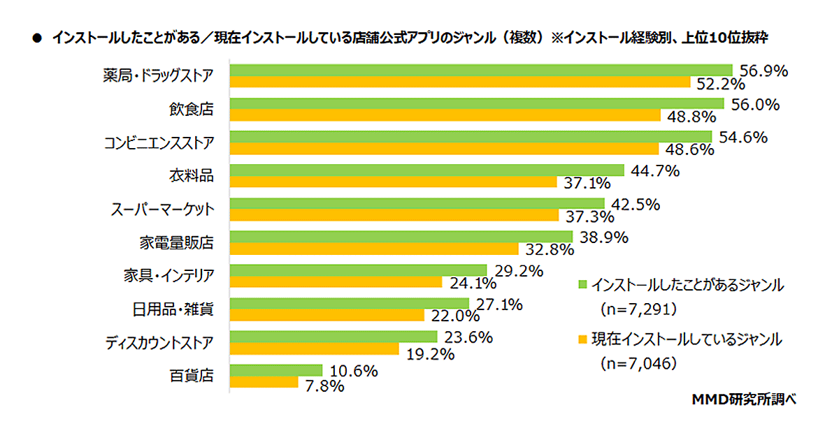 インストールしたことがあるアプリ上位は「薬局・ドラッグストア」「飲食」「コンビニ」
