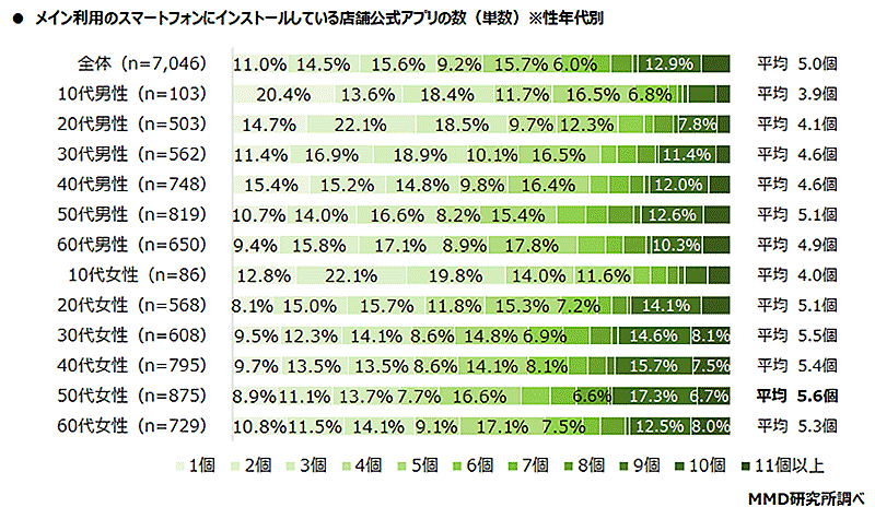 店舗公式アプリを現在インストールしているユーザーに、インストールしている店舗公式アプリ数を聞いたところ、平均は5.0個だった。性年代別でみると、平均個数は50代女性が5.6個と最も多く、次いで30代女性が5.5個、40代女性が5.4個だった。男性よりも女性の方が平均個数が多く、年齢が下がるほど減少することがわかった。