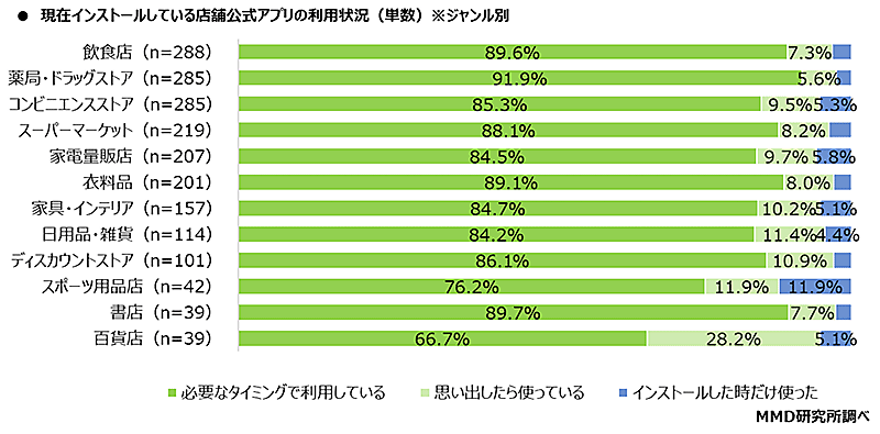 店舗公式アプリを現在利用しているユーザーを抽出し、現在インストールしている店舗公式アプリの利用状況について聞いた。「必要なタイミングで利用している」と回答したのは「薬局・ドラッグストア」(91.9%)が最多、次いで「書店」(89.7%)「飲食店」(89.6%)だった。