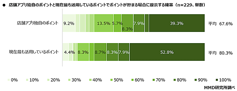 その結果、「100%」が最も多く、店舗アプリ独自のポイントは平均67.6%、現在最も活用しているポイントは平均80.3%だった。