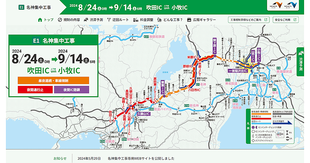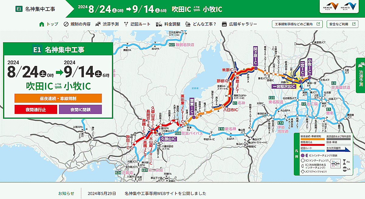 名神高速道路の集中工事区間は、吹田IC(大阪府)と小牧IC(愛知県)間の上下線。工事期間は8月24日(土)~9月14日(土)。
