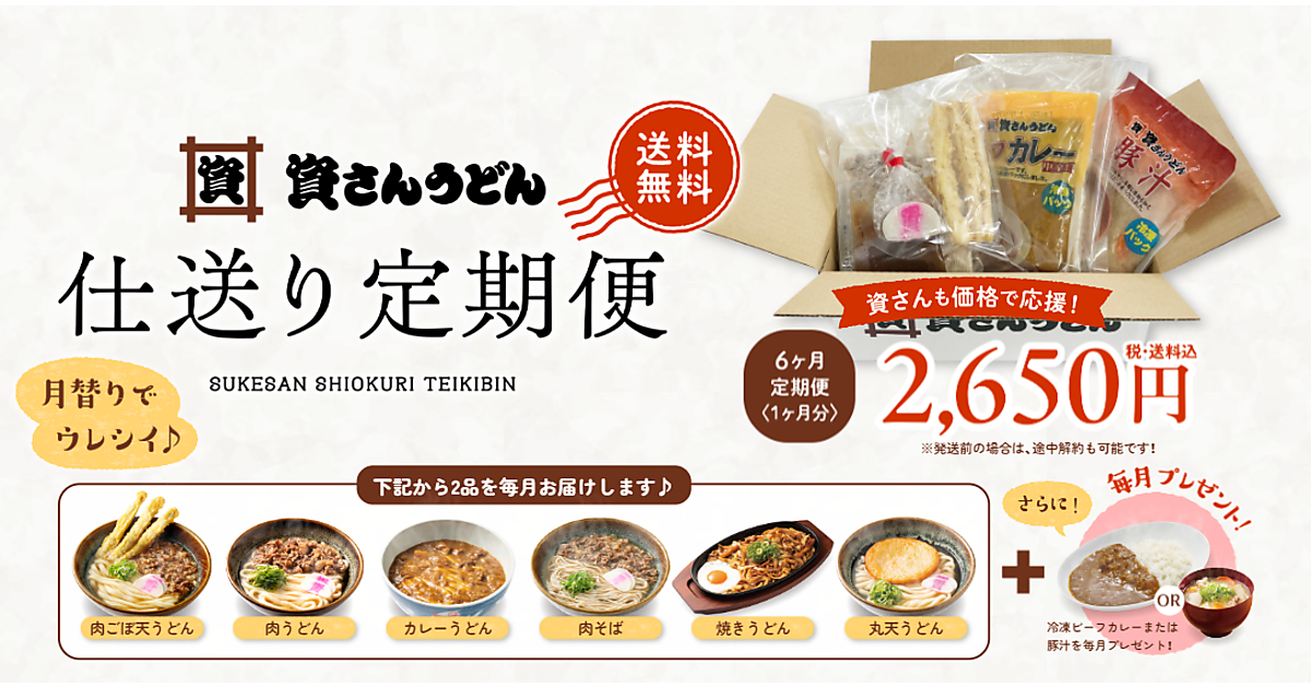 九州を中心にうどん外食チェーン店「資さんうどん」を展開する資さん(すけさん)は8月26日、自社ECサイト「資さんストア」で定期便型の食品ギフト「仕送り定期便」サービスを開始した。