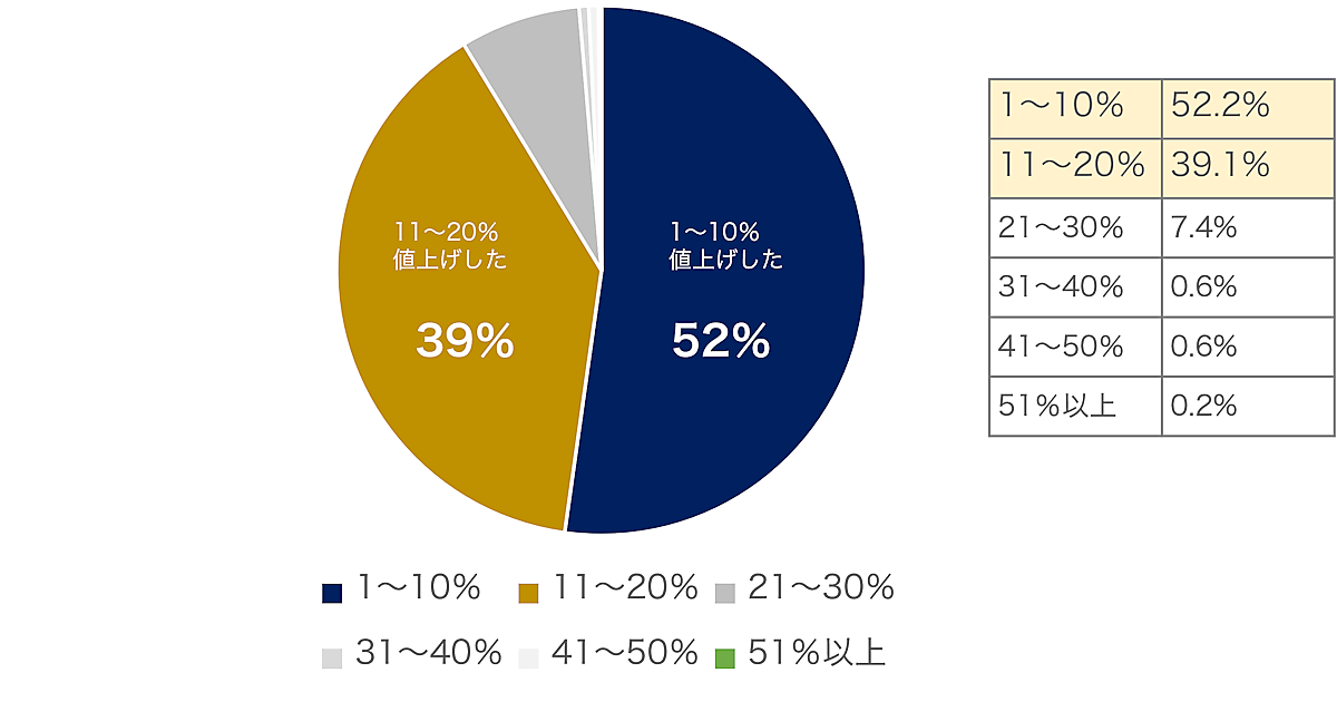 値上げ幅についても聞いた。値上げ実施事業者のうち90%が、元の価格から20%以内の値上げ幅で値上げを実施。そのうち、10%以下の値上げが半数以上を占めた。21%以上の値上げを実施した事業は1割以下にとどまった。