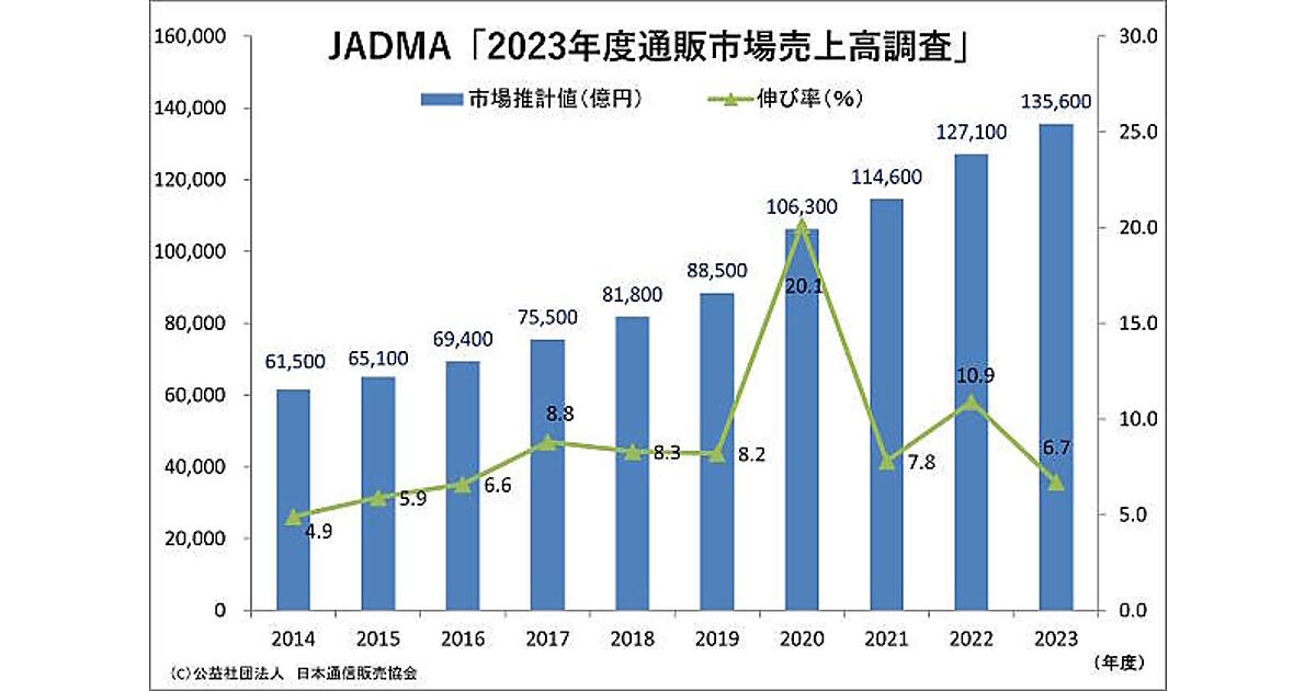 公益社団法人日本通信販売協会(JADMA)が8月27日に発表した2023年度(2023年4月-2024年3月)の通販・EC市場の売上高は、前年度比6.7%増の13兆5600億円だった。金額ベースでは同8500億円の増加。