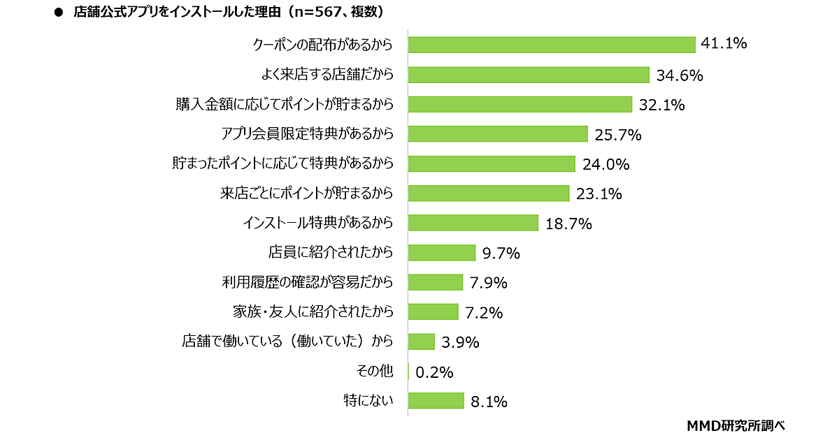 店舗公式アプリを現在利用しているユーザーに、店舗公式アプリをインストールした理由を聞いたところ、トップは「クーポンの配布があるから」(41.1%)で、「よく来店する店舗だから」(34.6%)「購入金額に応じてポイントが貯まるから」(32.1%)が続いた。