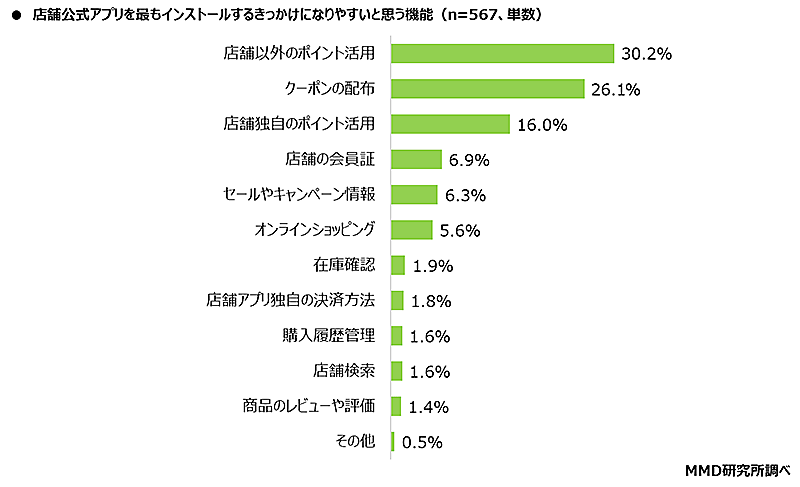 店舗公式アプリをインストールするきっかけに最もなりやすいと思う機能については、「店舗以外のポイント活用」(30.2%)が最も多く、次に「クーポンの配布」(26.1%)「店舗独自のポイント活用」(16.0%)だった。