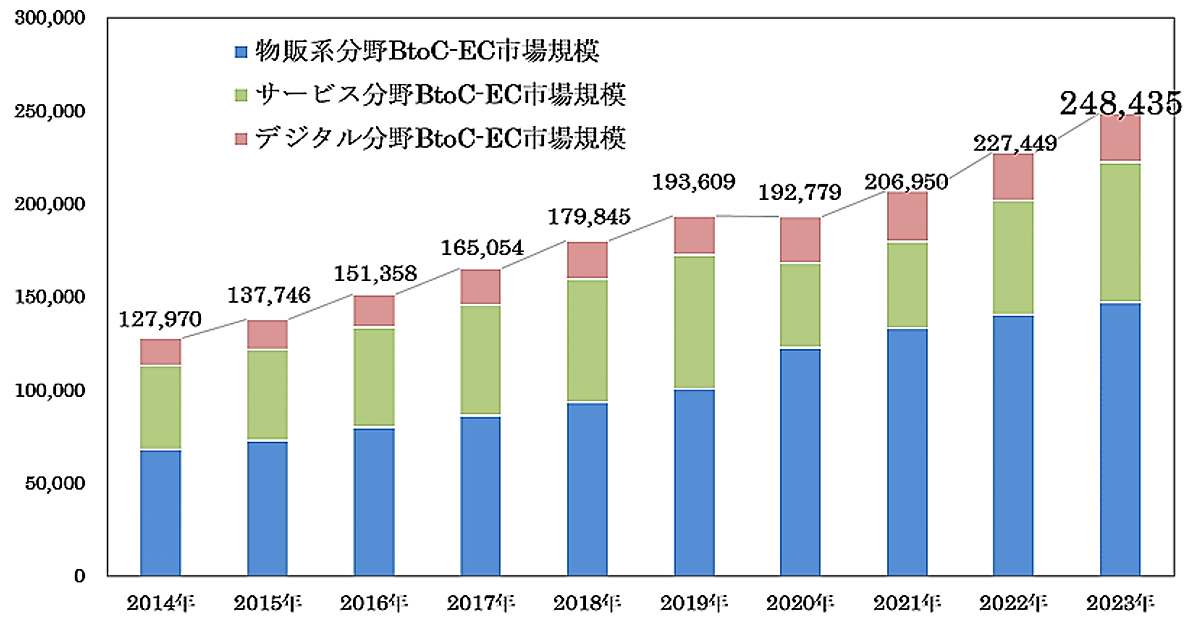 経済産業省が9月25日に発表した「令和5年度デジタル取引環境整備事業(電子商取引に関する市場調査)」によると、2023年のBtoC-EC市場規模は24兆8435億円で前年比9.23%増だった。