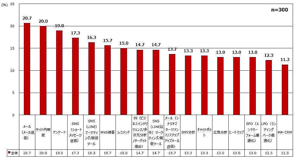 通販事業者が導入に失敗・解約したEC関連サービスについて聞いた。トップは「メール送信」が20.7%。次いで僅差で「サイト内検索」(20.0%)「アンケート」(19.0%)と続いた。
