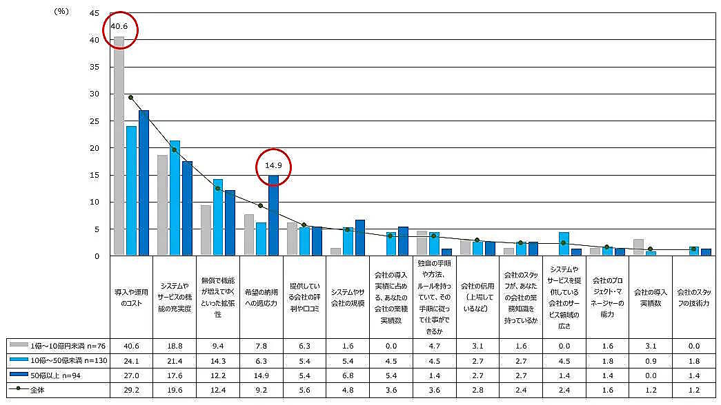 年商別の回答傾向としては、年商1億円~10億円未満といった規模の事業者は「導入や運用のコスト」40.6%と高いスコアとなった。年商50億円以上の事業者もトップは「導入や運用のコスト(27.0%)」だったが、「希望の納期への適用力」が14.9%と平均値と比べ手高い傾向となった。エルテックスでは「規模の大きさから計画通りにシステムの構築や移行が進まないと、事業計画や、上場企業は株価に影響がある、といった危惧などが背景にあると思われる」と分析している。