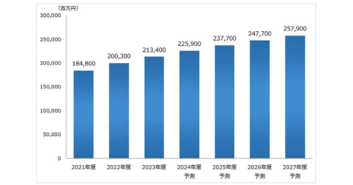 2023年度はEC事業への新規参入が落ち着き市場成長率は低下したものの、事業規模が拡大したEC事業者による上位サービスへのリプレイス需要が増加したという。2023年度のECサイト構築支援サービス市場規模は、事業者売上高ベースで前年度比6.5%増の2134億円と推計。今後も市場は拡大する見通しで、2024年度は同5.9%増の2259億円、2027年度には2500億円を突破すると見ている。