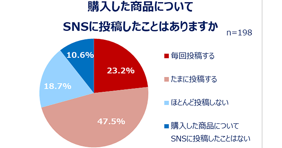 SNS投稿をする人のうち、SNSで購入した商品について投稿したことがあるかを聞いたところ、約7割が投稿している。頻度は「毎回投稿する」(23.2%)、「たまに投稿する」(47.5%)となった。
