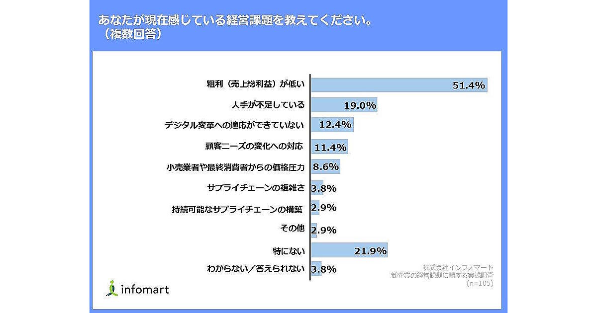 現在の経営課題について聞いたところ(複数回答)、圧倒的に多かったのが「粗利(売上総利益)が低い」で51.4%。「特にない」が21.9%、「人手が不足している」が19.0%、「デジタル変革への対応ができていない」が12.4%で続いた。