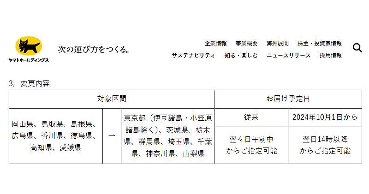 ヤマト運輸は10月1日から、一部区間において宅急便などの配達日数と指定時間帯を変更する。