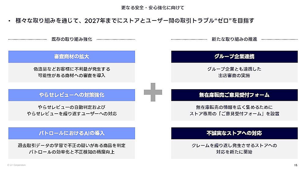 新たな取り組みとして「LINEヤフーグループ内での連携強化」「無在庫転売ご意見受付フォームの開設」「クレームを繰り返し発生させるストアへのペナルティ強化」なども進める。