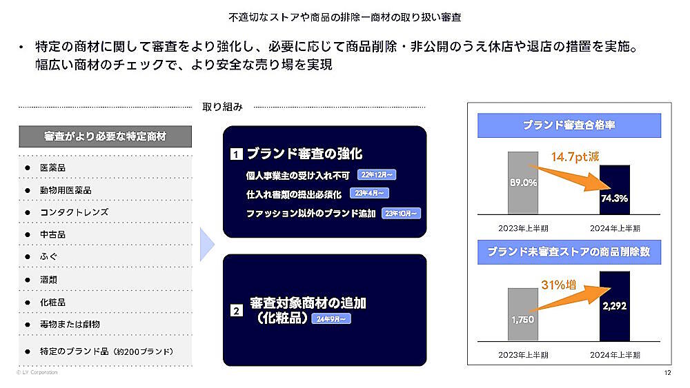 - 商材の取り扱い審査では、対象とする商材およびブランドの拡大や仕入れ書類の提出必須化などを通じて審査を強化。2024年上半期のブランド審査の合格率は、2023年上半期の89.0%から14.7ポイント減の74.3%に減少