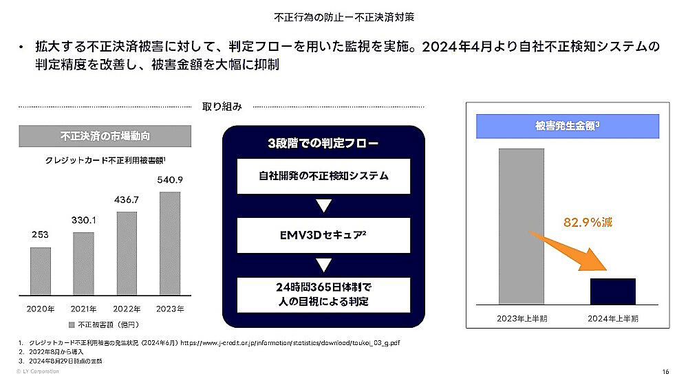 - 年々増加しているクレジットカードの不正利用被害への対策について、2024年4月以降、自社開発の不正検知システムの判定精度を改善。この結果、2024年上半期の不正決済の被害金額は、2023年上半期と比較して82.9%減となり、被害の抑制につながった。