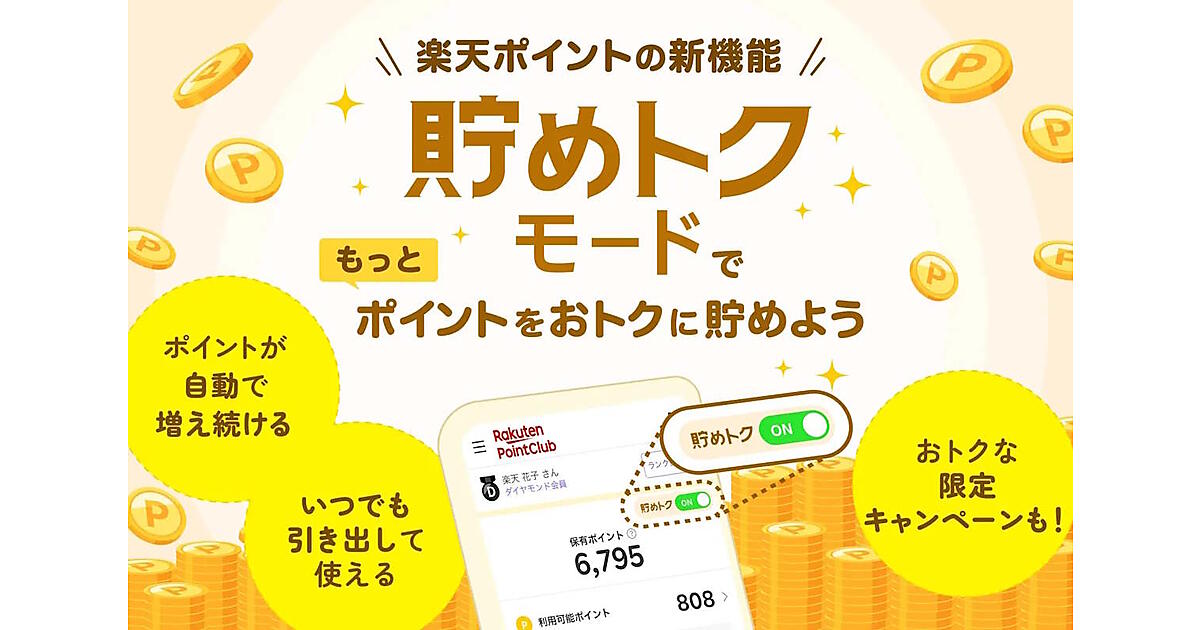 楽天グループ(楽天)は9月13日、「楽天ポイント」の利用状況などが確認できる「楽天PointClub」において、「楽天ポイント」に自動で利息が付く新機能「貯めトクモード」の本格提供を開始したと発表した。