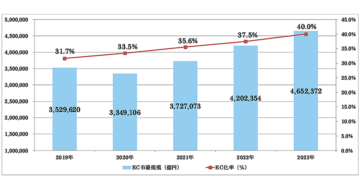 経済産業省が9月25日に発表した「令和5年度デジタル取引環境整備事業(電子商取引に関する市場調査)」によると、2023年のBtoB-EC(企業間電子商取引)の市場規模は前年比10.7%増の465兆2372億円で、EC化率は40.0%の同2.5ポイント増だった。