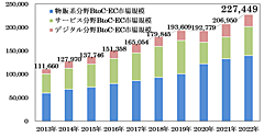 消費国としての中国の越境BtoC-EC(日本・米国からの購入)の総市場規模5兆3911億円で同7.7%増。このうち、日本からの購入額規模は2兆4301億円、米国経由は2兆9610億円(同7.7%増)。