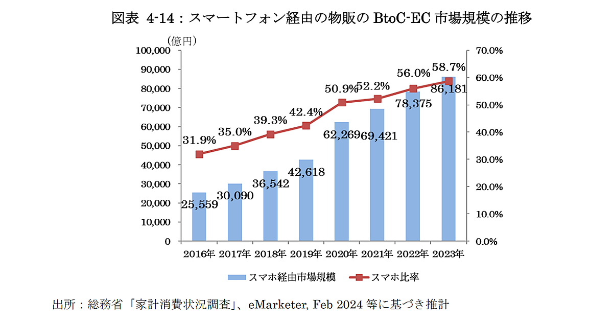 経済産業省が9月25日に発表した「令和5年度デジタル取引環境整備事業(電子商取引に関する市場調査)」によると、物販系BtoC-EC市場におけるスマートフォン経由の市場規模が堅調に推移した。