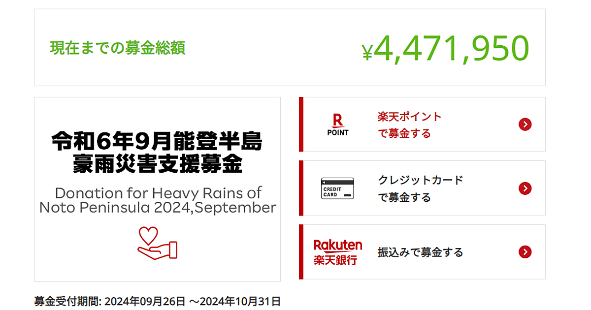楽天グループ(楽天)は9月26日から、インターネット募金「楽天クラッチ募金」において、「令和6年9月能登半島豪雨被害支援募金」への寄付受付を開始した。受付期間は同10月31日まで。募金は被災者支援を目的として全額寄付する。