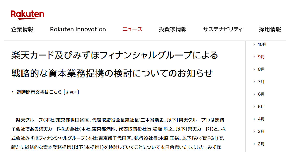 楽天グループ(楽天)は9月30日、連結子会社の楽天カードとみずほフィナンシャルグループ(みずほFG)において戦略的な資本業務提携を検討していくことで合意したと発表した。12月31日までに提携の効力発生をめざす。