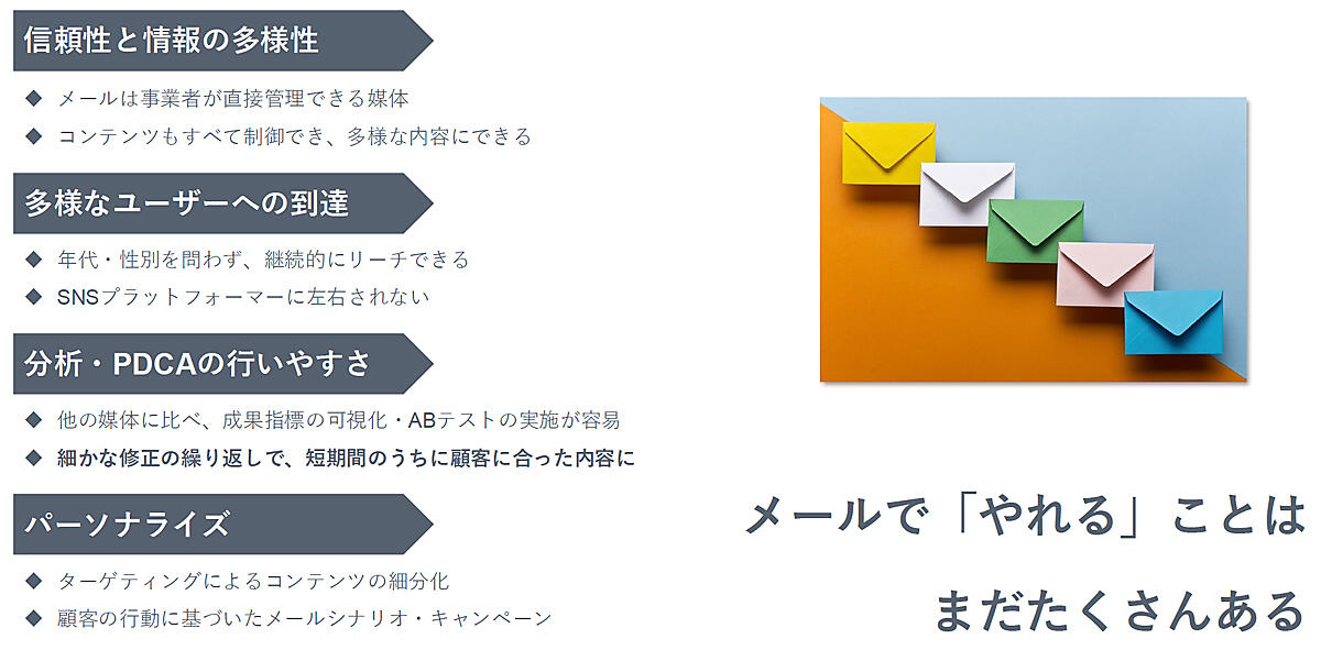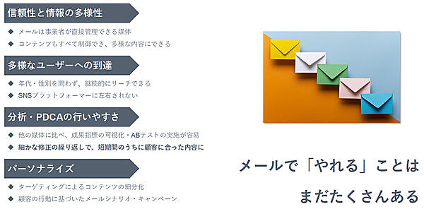 一方、継続率を高めたいという課題にはどう対応するべきなのだろうか。園田氏が次回購入を促進するための施策の1つとして提案するのは、メールでのコミュニケーション。LINEやInstagramも選択肢になるBtoC-ECと異なり、BtoB-ECの場合はメールの重要度が高い。