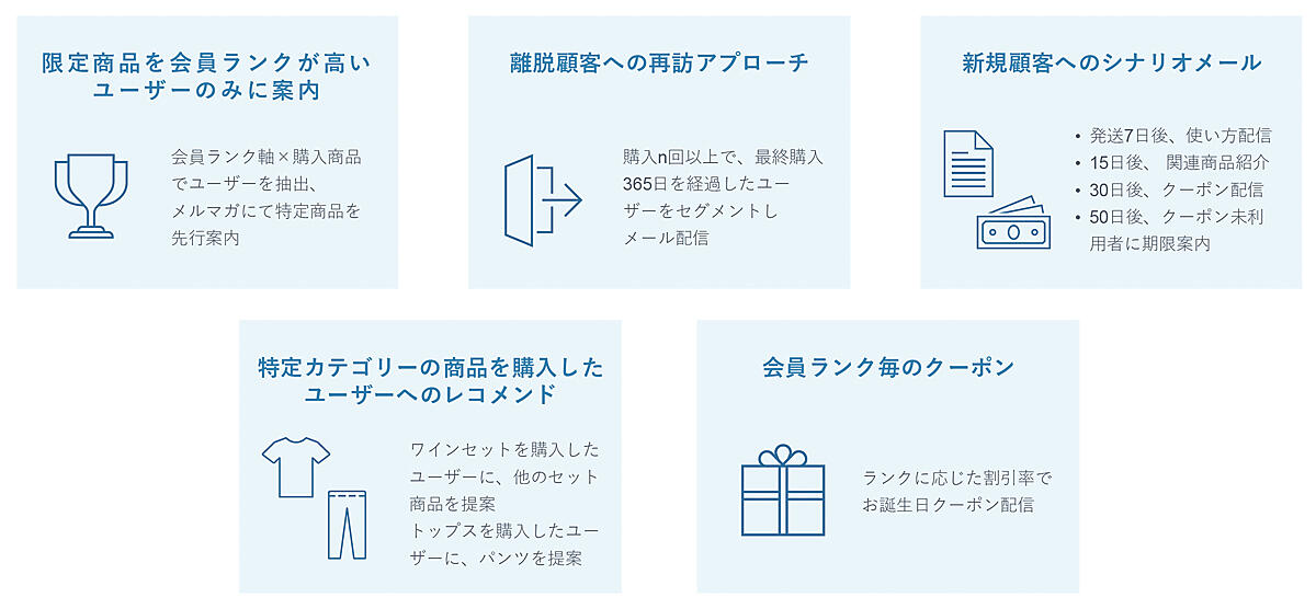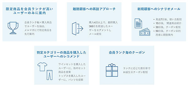 どのようなマーケティング施策が効果的なのかについては、BtoC-ECから学べる部分が多い。たとえば、BtoCでは会員ランク制度を導入し、会員ランクが高いユーザーには特別な商品を案内するといった施策がある。これはBtoB-ECでも応用可能だ。取引額によってサービスの差別化を行い、そのサービスをメールで通知していく。これらはMA、あるいはCRMツールを使って実施できる。