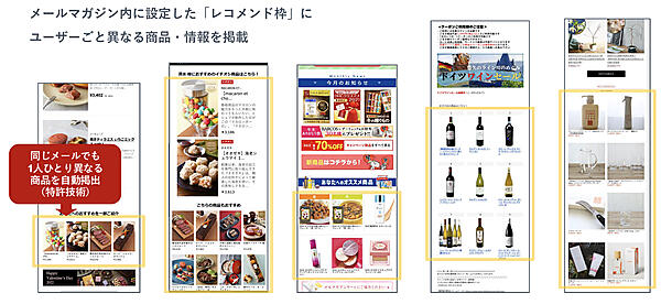 3つ目を実現するのがレコメンドエンジンだ。メールマガジン内に設定したレコメンド枠に、ユーザーごとに異なる商品や情報をAIが自動生成して掲載する。シルバーエッグ・テクノロジーが提供するリアルタイム・レコメンドメールサービス「レコガゾウ」は、提案すべき商品やコンテンツをユーザーごとに判断し、自動的に出し分けることができる。