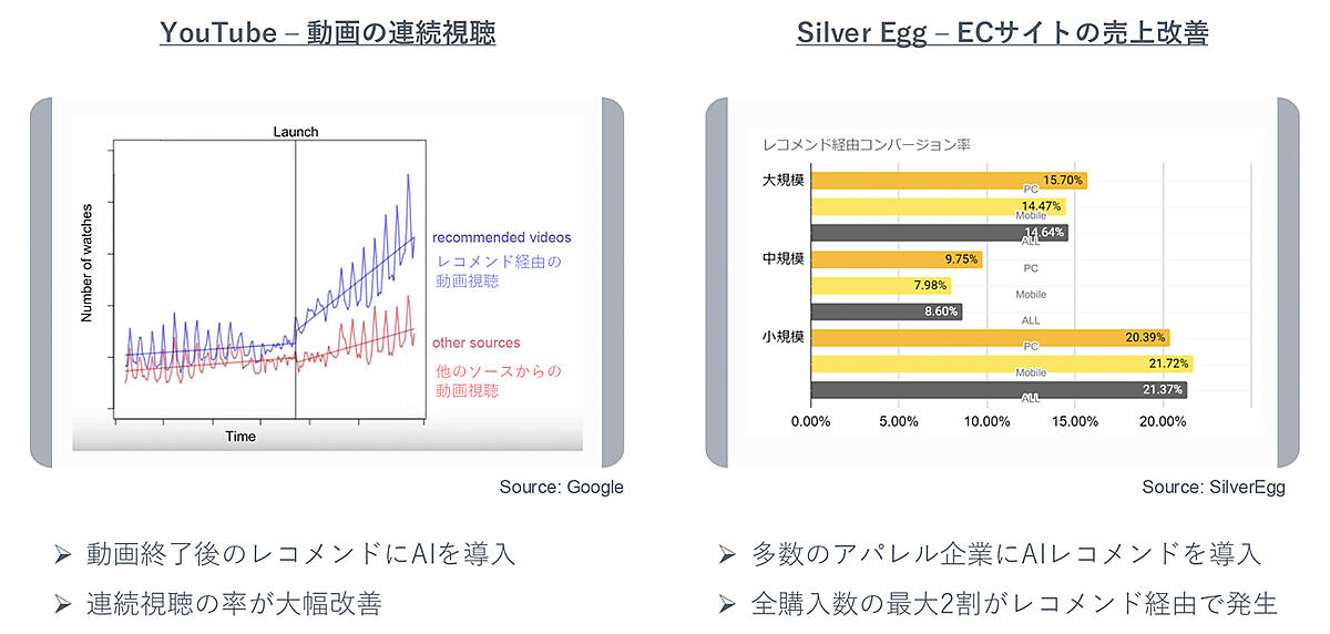 レコメンドの導入効果の実例としてわかりやすいのが「YouTube」。レコメンドエンジンをAIベースのものに置き換えており、動画の連続視聴回数、時間の占有率、来訪回数などが増加しているという。「YouTube」を利用しているユーザーであれば、自身の興味・関心に適した動画がレコメンドされてくるのがわかるだろう。