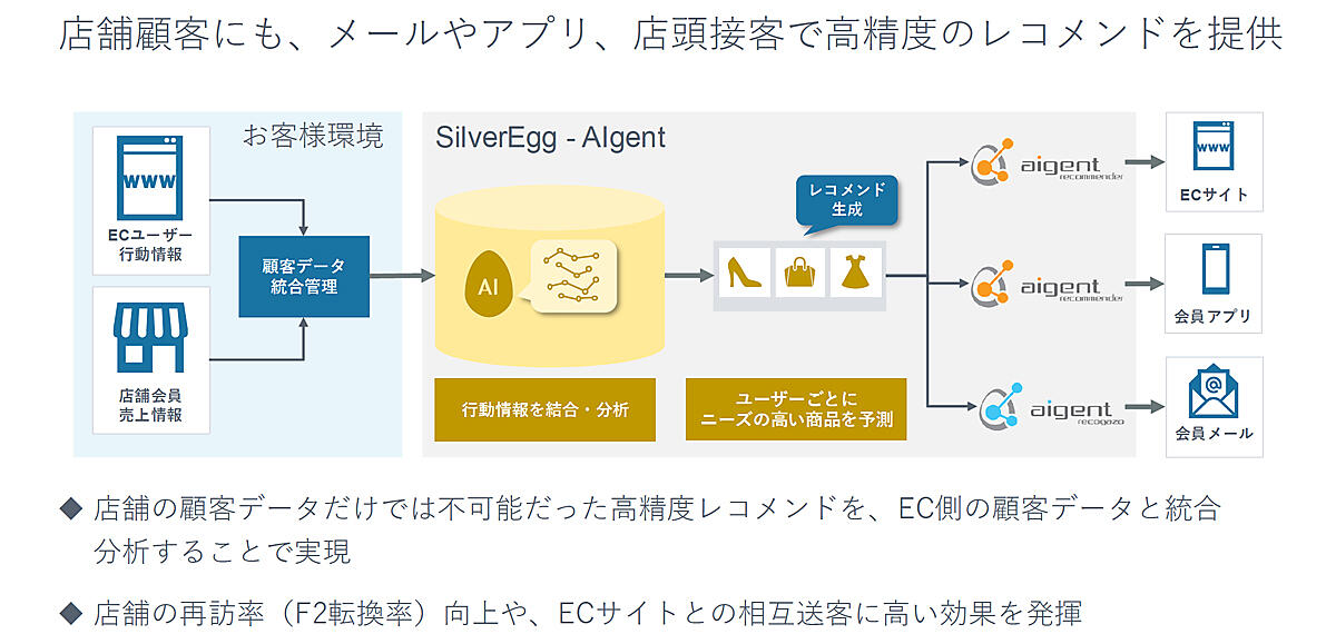 これはBtoB、BtoCに共通と言えるのだが、継続利用率やサイト利用率を上げていくことが売り上げを伸ばすための鉄則。そのためにシルバーエッグ・テクノロジーが提案するのが、AI技術を利用したレコメンドエンジンだ。