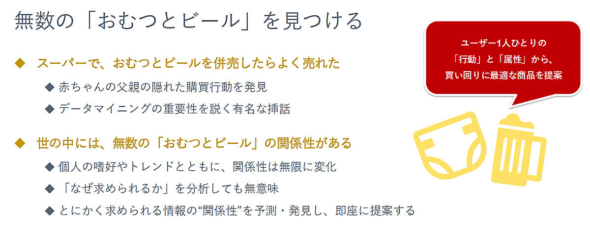 3つ目の新規需要の創出は、目的のモノしか購入されないという状況を変えようというものだ。レコメンドエンジンは、ユーザーがどんな商品を組み合わせて買っているか、閲覧しているかというデータから、特定のユーザーに彼らがそれまで見たことのない商品を紹介できる。