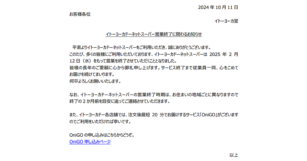 イトーヨーカドーネットスーパーは25年2月に営業終了。店舗起点の配達サービスは維持するとし、利用者向けにはすでに展開している「OniGO」による配送利用へのシフトを案内している。
