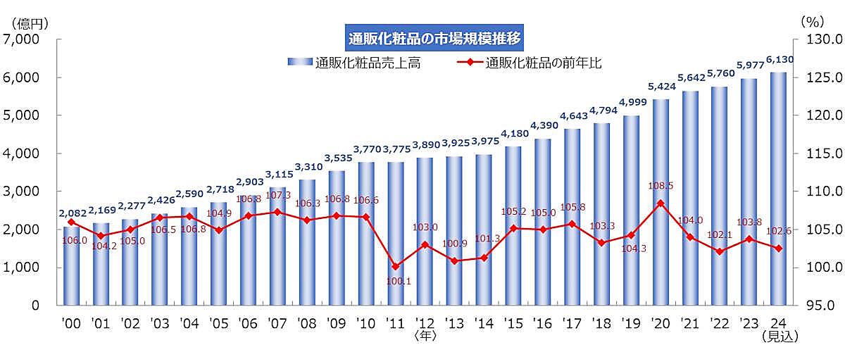 2024年の通販化粧品市場は、前年比2.6%増の6130億円となる見込み。ECモールが存在感を示すなか、ECモール内の戦略を強化して顧客の裾野を拡大する傾向が見られる。一方、公式サイトと店販などの連携を強化して顧客の囲い込みを強化する動きも強まっている。