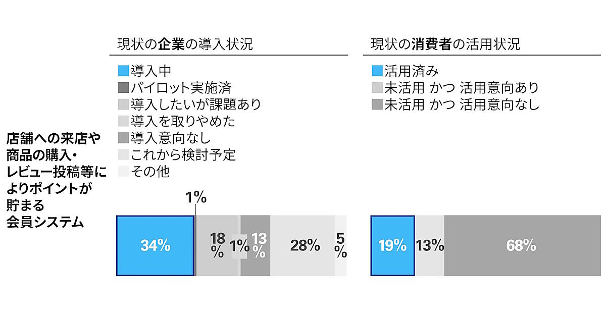 「OMOにおけるロイヤルティプログラム」の企業側の取組み状況に対し、消費者側の活用は進んでいない。店舗への来店や商品購入でポイントがたまる会員システムは6割程度の企業が導入済み・導入検討だったが、活用済み・活用意向がある消費者は3割程度と大きく乖離している。