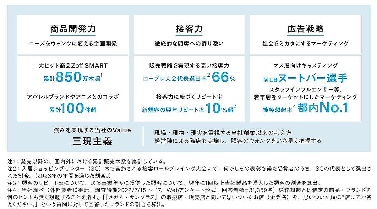 インターメスティックは商品開発力、接客力、マーケティングを強みにあげている。アパレルブランド・アニメとのコラボレーションなどの推進、カスタマイズレンズの店頭提案を強化、接客力に基づく客単価の上昇につなげている。顧客リピート率も新規顧客の10%以上が購入年にリピート顧客となっているという。