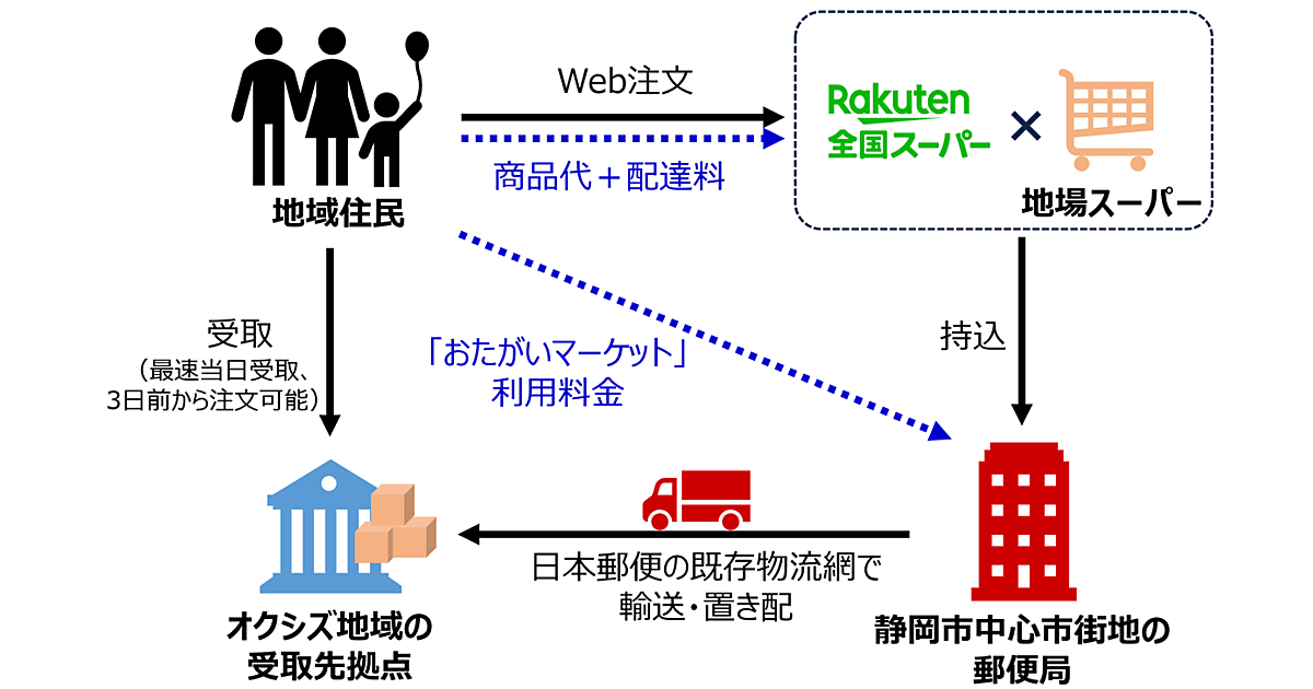 奥静岡地域に地域住民の共同受け取り拠点を設け、「楽天全国スーパー」に出店するタカラ・エムシーの「フードマーケットマム ネットスーパー」で注文した商品を届ける。