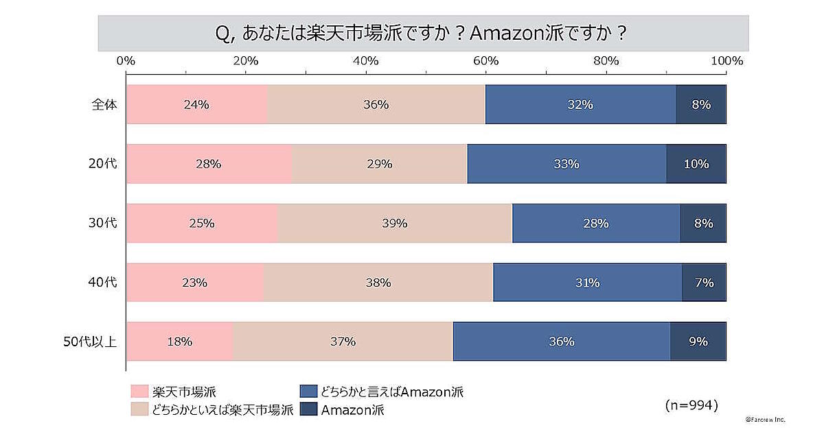 「楽天市場派」(24%)「ちらかといえば楽天市場派」(36%)の合計は60%、「どちらかいえばAmazon派」(32%)「Amazon派」(8%)の合計は40%だった。回答した各年代(20歳代、30歳代、40歳代、50歳代以上)で「楽天市場派」が「Amazon派」を上回った。