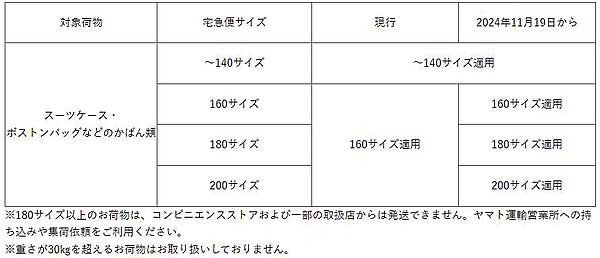 スーツケース・ボストンバッグなどのかばん類は現在、宅急便サイズ140~200までの荷物は140サイズ以外、160サイズを適用している。11月19日からは、各サイズに応じた料金をそれぞれ適用する。