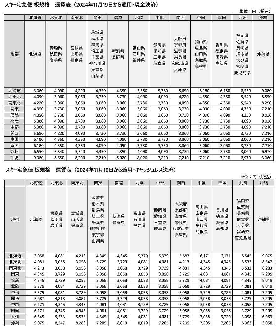 一例をあげると11月19日以降、スキー板、スノーボード、オールインワン型ケースを関東から信越に現金決済で宅配した場合、現行運賃は宅急便160サイズの適用で2510円だが、11月19日以降は3060円で550円の値上げとなる。