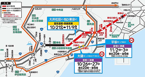 集中工事が実施されている区間は東京ICと大井松田IC間の上下線。工事期間は10月21日(月)0時~11月9日(土)6時までで、昼夜連続で車線が規制。この影響により、交通規制に伴う渋滞、迂回ルートにおいて渋滞などの発生が予想されている。