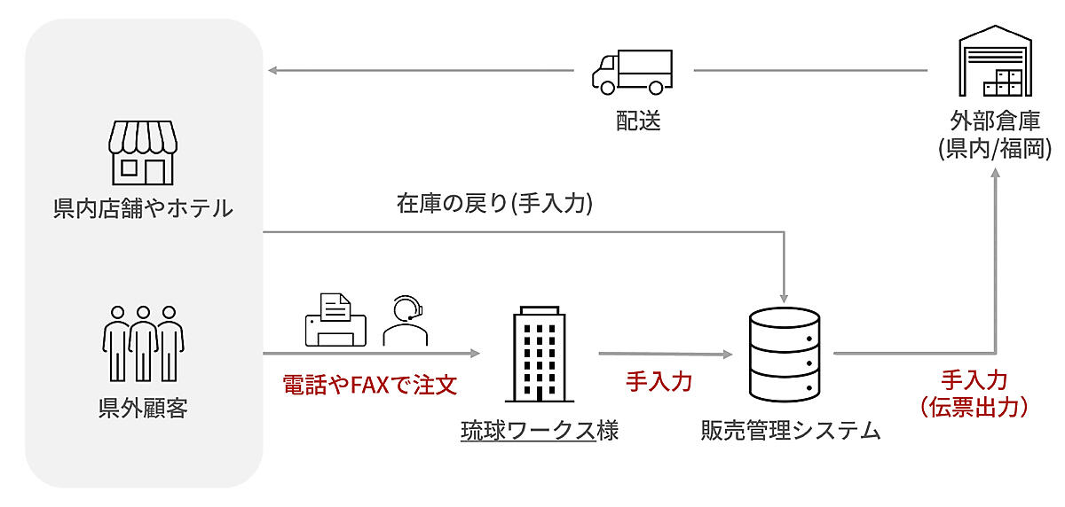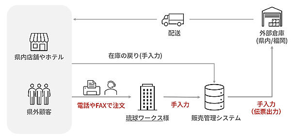 「Bカート」導入前、琉球ワークスは電話とFAXで注文を受けており、注文を販売管理ツールに手動で入力、そこから伝票を出力して倉庫へ手渡して商品を配送していた。商品が戻ってきたときにはまた手動で入力し、伝票を出力するの繰り返し。そのため、FAX注文の対応にかなりの時間を取られてしまい、新規企画も営業がまったく行えていなかった。
