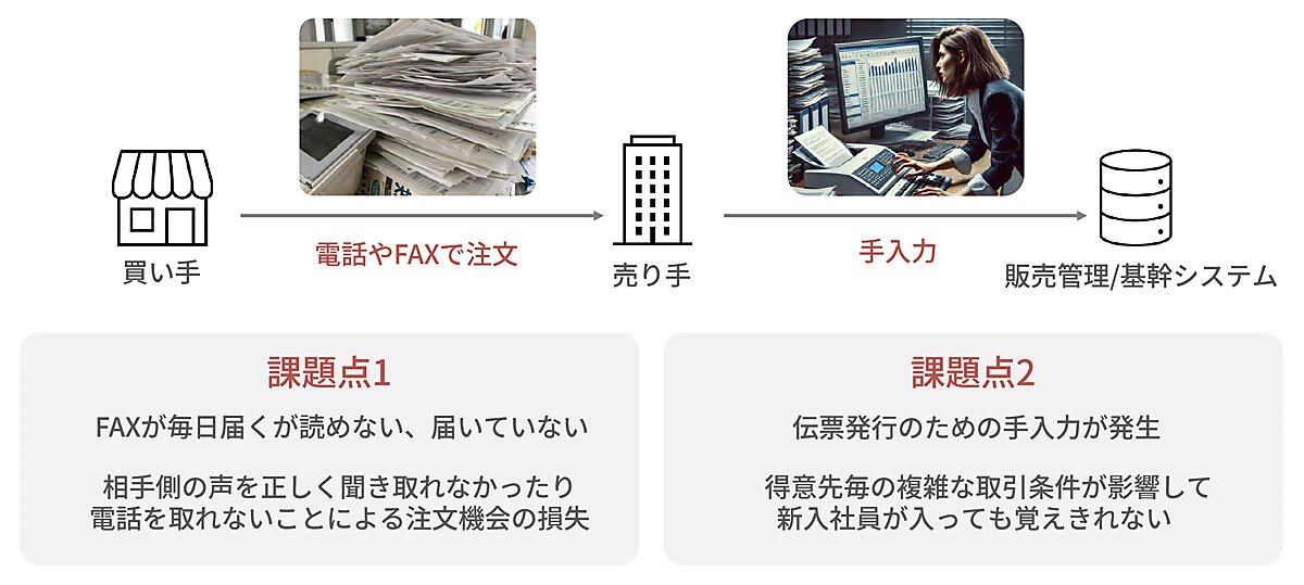 従来型のアナログな企業間取引にはさまざまな課題がある。まず、受注時に発生する課題だ。FAXが毎日大量に届くものの、書いてある内容が読めないこともあれば、そもそも取引先が送ったはずのFAXが見つからないといったこともある。電話注文はやり取りに時間がかかり、確認しても言い間違い・聞き書き間違いが発生する。こういった状況ではトラブルや機会損失は避けられない。