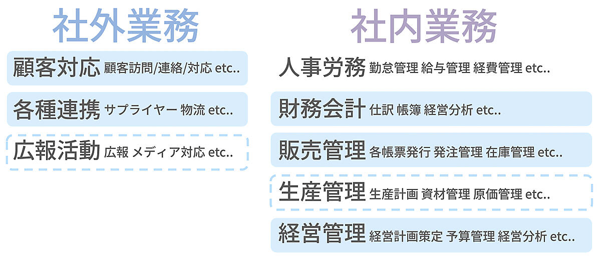 業務を分解してみると、社外業務は顧客や協力企業との連携、広報活動などがある。社内業務は人事労務や会計、生産や販売の管理業務といったものがある。これを「受注」「出荷」「売上」という3つの情報の流れを図式化すると次のようになる。