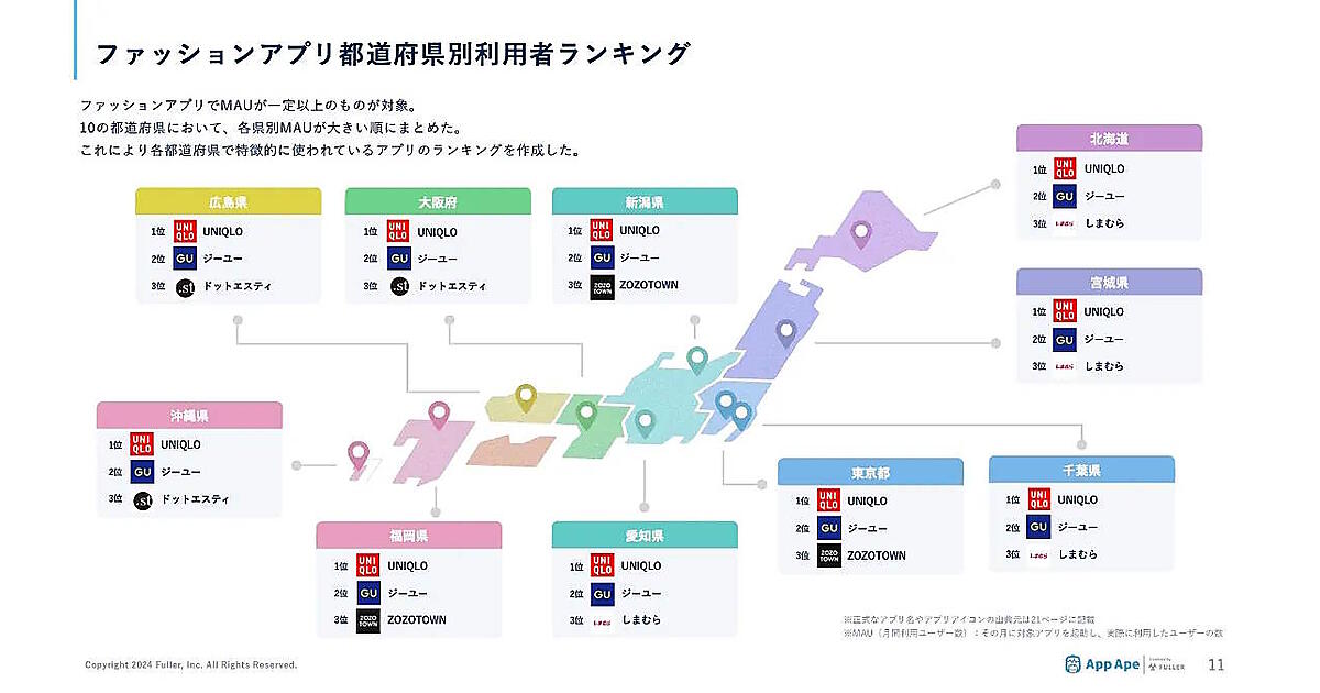 「ファッションアプリ市場レポート2024」では、月あたりのアクティブユーザー数(MAU)が一定以上のファッションアプリを対象に、10の都道府県において各県別MAUの大きい順にまとめ、各都道府県で特徴的に使われているアプリのランキングも作成した。