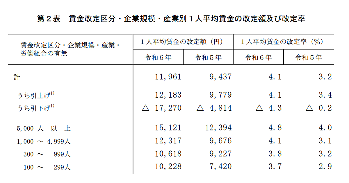 「1人平均賃金の改定額」は1万1961円(前年9437円)となり、平均改定率は同0.9ポイント増の4.1%となった。