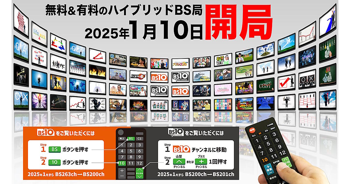 ジャパネットホールディングスのグループ会社でBS放送事業を担うジャパネットブロードキャスティングは2025年1月10日、「BSJapanext」と「スターチャンネル」が合併した新たな放送局「BS10(ビーエステン)」を開局する。